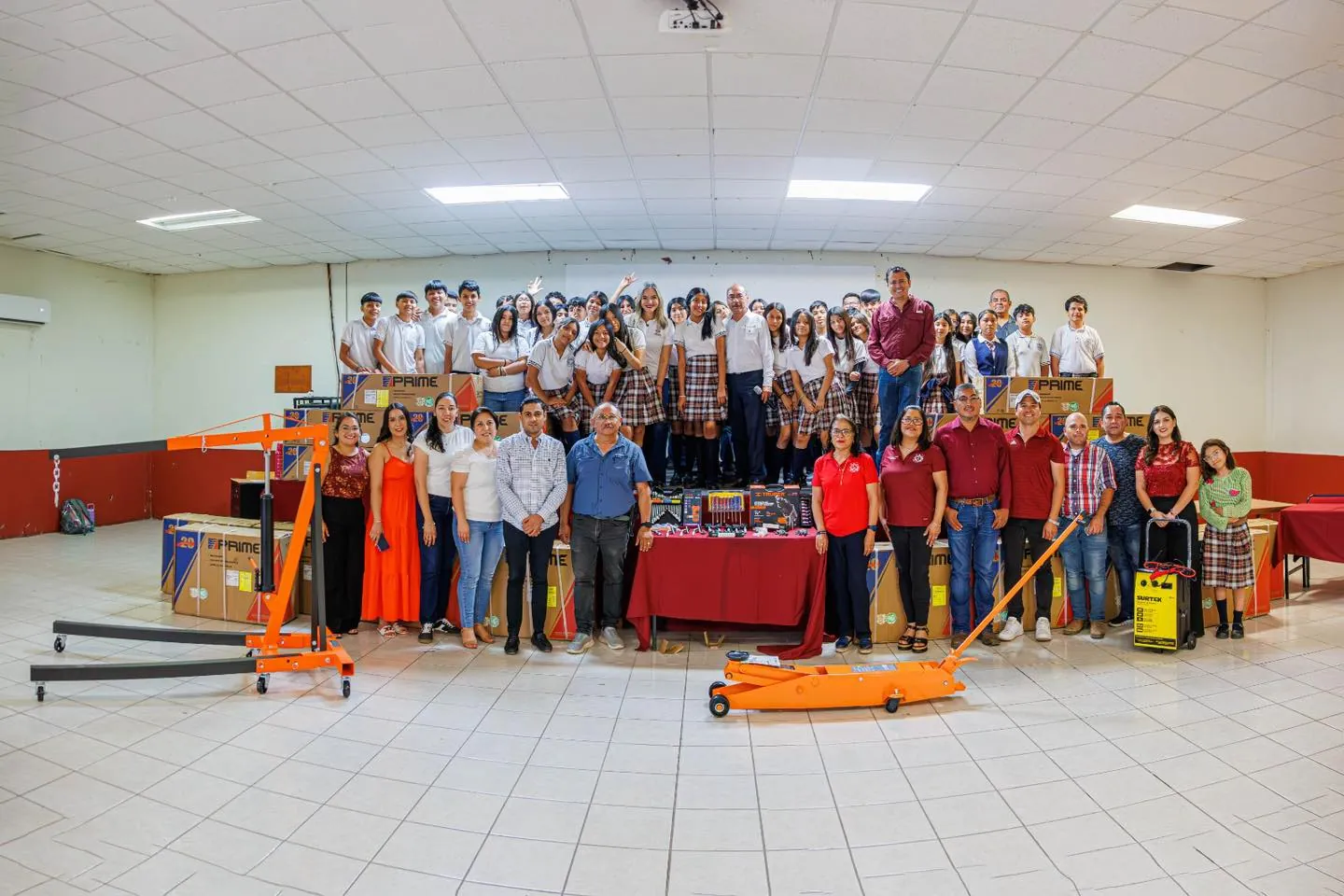 "Entre los equipos donados destacan un cargador de batería para auto, un gato hidráulico así como una pluma hidráulica entre otras herramientas más que contribuirán a mejorar las prácticas escolares y a reforzar el aprendizaje de los alumnos."